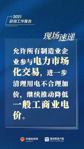 3月5日上午9時,第十三屆全國人民代表大會第四次會議在人民大會堂舉行開幕會,國務院總理李克強作政府工作報告。李克強指出:推進能源、交通、電信等基礎性行業(yè)改革,提高服務效率,降低收費水平。允許所有制造業(yè)企業(yè)參與電力市場化交易,進一步清理用電不合理加價,繼續(xù)推動降低一般工商業(yè)電價。